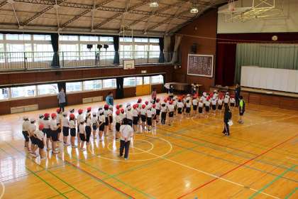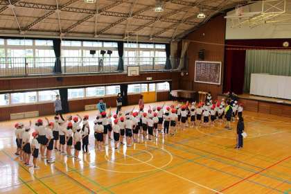 全員がコースごとに並びました。全校合同徒競走の事前練習です。