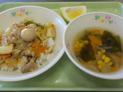 本日の献立:中華丼、たまねぎとわかめのスープ、くだもの