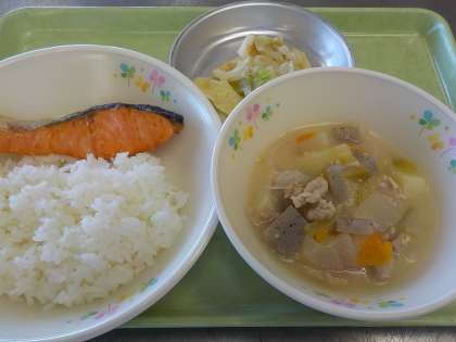 本日の献立:ごはん、鮭の塩焼き、呉汁、梅おかかキャベツ