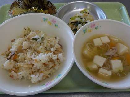 本日の献立:ちらし寿司、笹かまぼこのヒスイ焼き、七夕汁、野菜の煮びたし