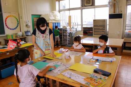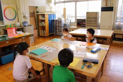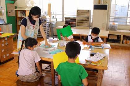 『まどから こんにちは』カッターナイフでいろいろな切り込みを入れて窓をつくりました。