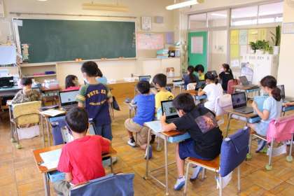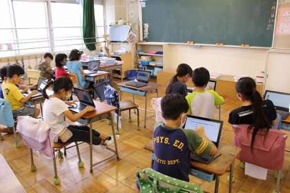 タブレット学習端末を使って、これまで撮影してきた「カイコ」の写真を整理しています。