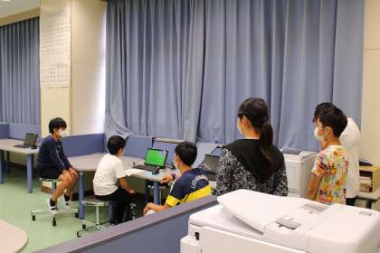 パソコン室から各教室にオンラインで実施しました。パソコン室の様子です。