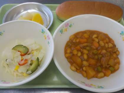 本日の献立:ミルクパン、ポークビーンズ、カラフルサラダ、フルーツミックス