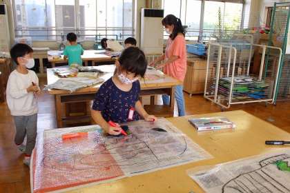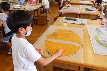 「ぷちぷちフィッシュ」魚のうろこに模様を塗っています。色鮮やかな魚が出来てきました。