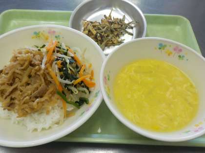 本日の献立:ビビンバ、コーンとたまごのスープ、ご豆ナッツ