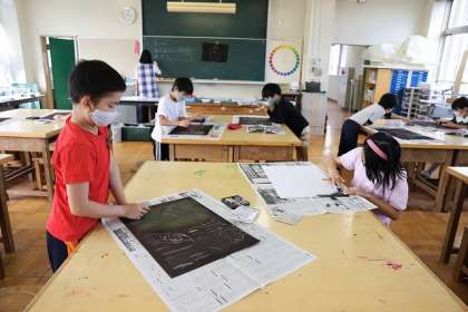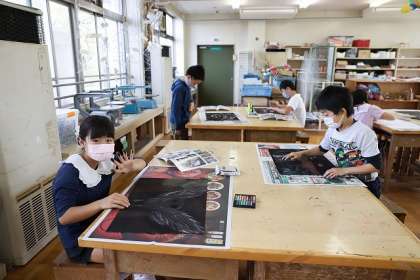 「消してかく」塗りつぶした画用紙に、消しゴムで消して模様をかいていきます。