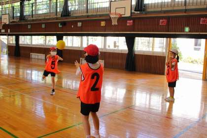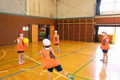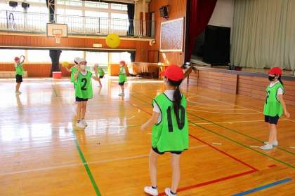 ゴール型ゲーム(ポートボール)ボールを使って、パス・キャッチの練習です。