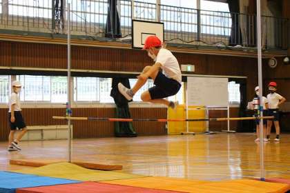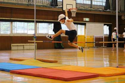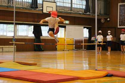 自分の跳ぶ位置を確認しています。どちらの足をあげて跳んでいるのかな?