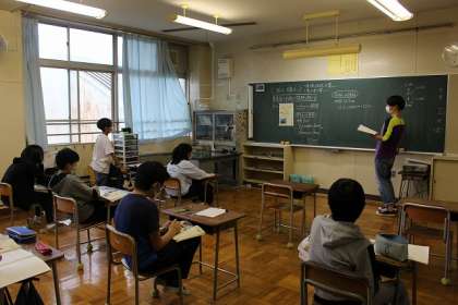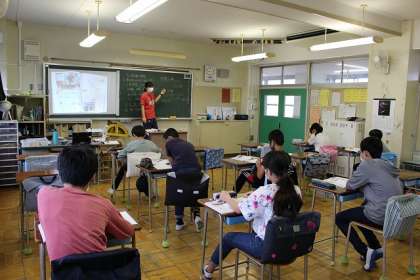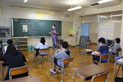 縮図を利用して問題を解いていきます。もう一方のクラスでは、身の回りにある「拡大・縮小」について考えています。