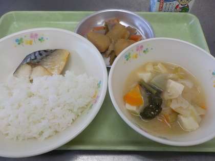本日の献立:ご飯、鯖の塩焼き、呉汁、里芋のころ煮