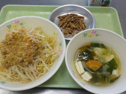 本日の献立:ジャージャー麵、チンゲン菜のスープ、黒糖ナッツ、くだもの