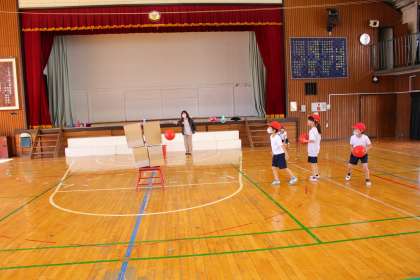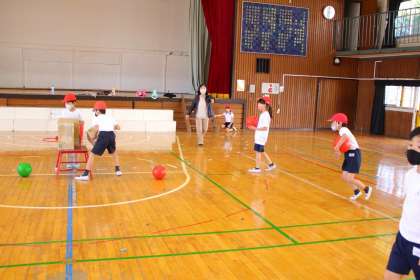 ボールゲームです。箱に向かってボールを投げます。箱1個1点です。自分たちで箱を戻していきます。制限時間ありです。