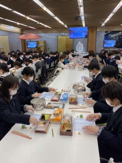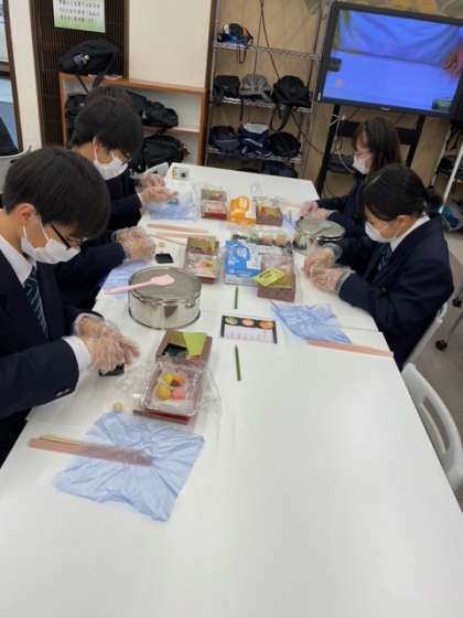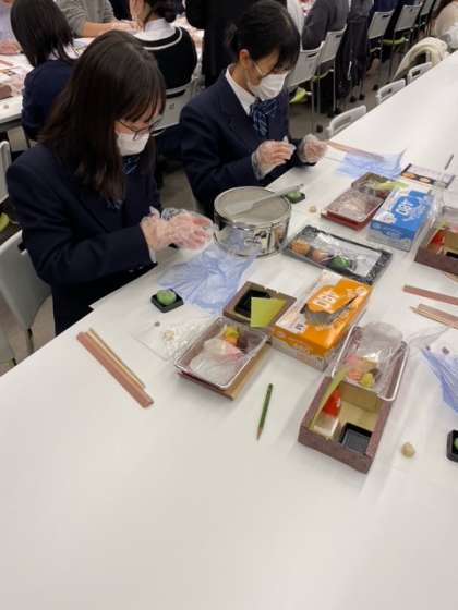 感染対策を行いながら、和菓子体験スタートです。先生のお手本を見ながら、三種類のお菓子を作る予定です。