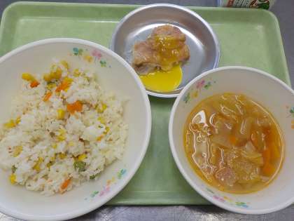 本日の献立:コーンライス、チキンソテーのパッションフルーツソース(八王子産)、ミネストローネ