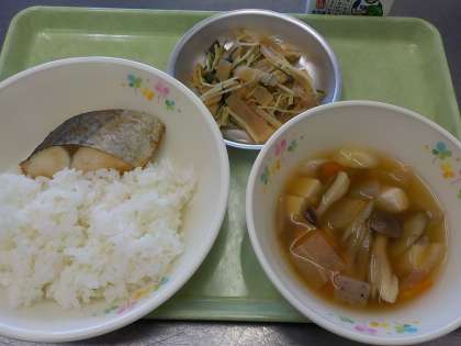 本日の献立:ごはん、さわらの西京焼き、けんちん汁、水菜のタイタン