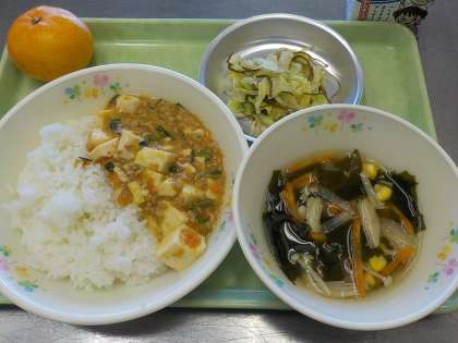 本日の献立:ごはん、マーボー豆腐、わかめとえのきのスープ、雑魚サラダ、くだもの