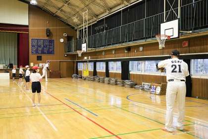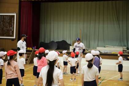 元プロ野球選手(ヤクルトスワローズ内藤選手、千葉ロッテマリーンズ内選手)をお迎えして行いました。準備運動、キャッチボールのお手本、ボールをキャッチする時の手の置き方を教えていただきました。