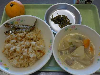 本日の献立:切り干しごはん、シシャモの磯辺焼き、呉汁、茎わかめのにんにく炒め、くだもの
