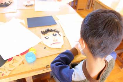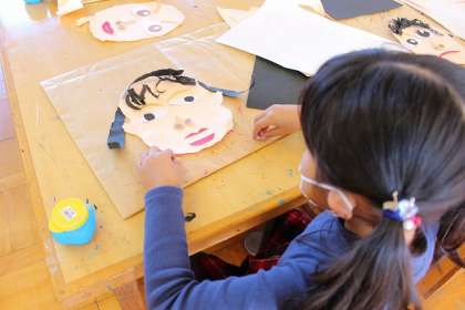 顔のパーツを動かしています。位置が決まったらのり付けしていきます。