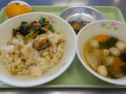 本日の献立:五目ちらし寿司、白身魚のさんみ焼き、七宝汁、のりあえ、くだもの