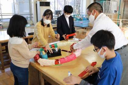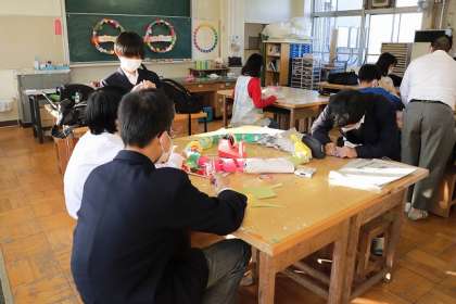 本校舎の図工室です。飾りのリースを制作しています。
