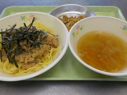 本日の献立:八大根のおろしスパゲティ、ジュリエンヌスープ、アーモンド黒糖