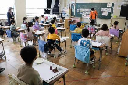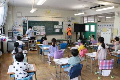 「たのしい あき いっぱい」いもはん画に挑戦です。説明を聞いています。