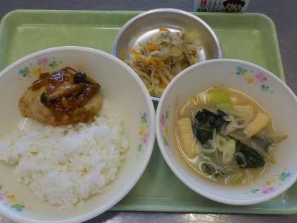 今日の献立:ごはん、豆腐のハンバーグきのこソース、キャベツの生姜風味、芋の味噌汁