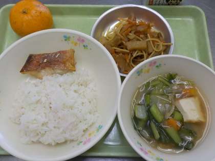 今日の献立:麦ごはん、赤魚のみそ焼きゆず風味、小松菜汁、五目きんぴら、くだもの