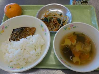 本日の献立:ごはん、サバの胡麻風味焼き、秋のお吸い物、野菜の彩り和え、くだもの