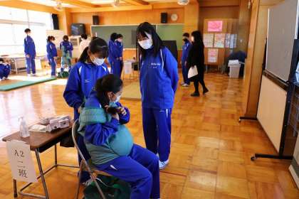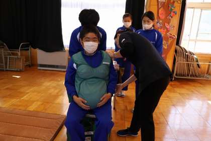 各学年に分かれて体験です。中学1年生は「妊婦体験ジャケット」を着用しています。