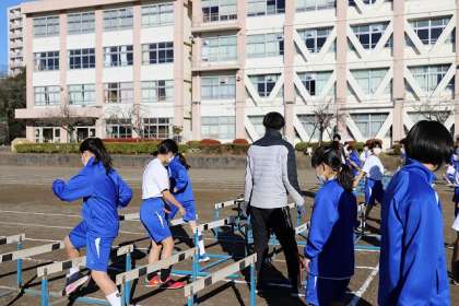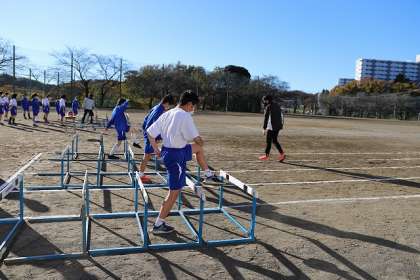 法政クラブの高橋先生・樋口先生をお迎えして「陸上教室(ハードル走)」を開催しました。1校時は、中学部1年生です。