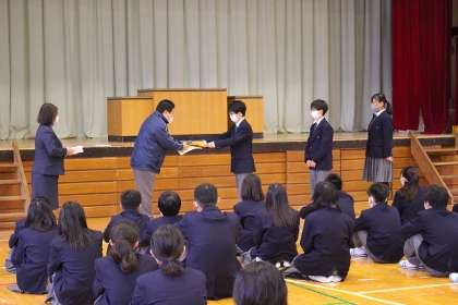 本校舎の体育館で行いました。科学コンクール努力賞の表彰も行いました。