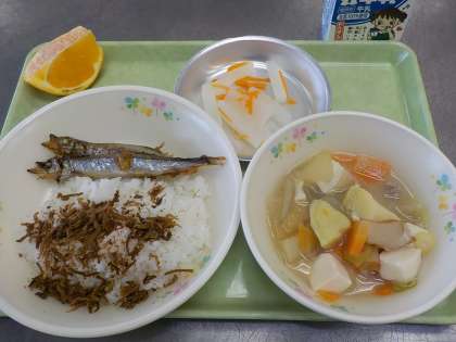 本日の献立:ごはん、ふりかけ、焼きシシャモ、さつま汁、八王子産ゆず大根、くだもの