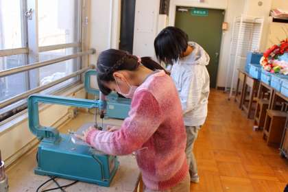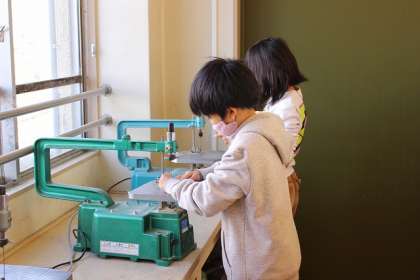「糸のこスイスイ」切った版木の組み合わせ方を考えて、切込みを入れていきます。