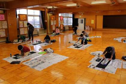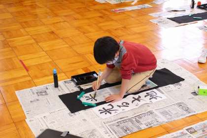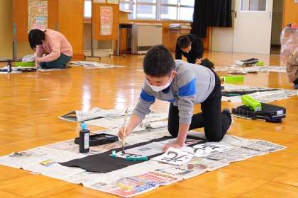 小野先生による「書き初め指導」です。たくさん書きました。すてきな文字ですね。