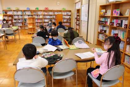 図書の時間です。図書カードの記録のまとめをしています。何冊読んだのかな?