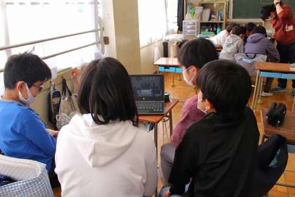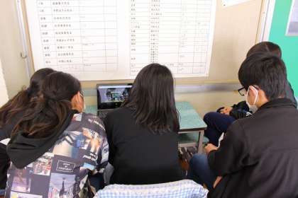 卒業式のビデオを視聴し、証書授与の様子を確認しています。