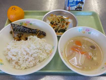今日の献立:きびごはん、サバの香焼き、根菜汁、ほうれん草の彩り和え、くだもの