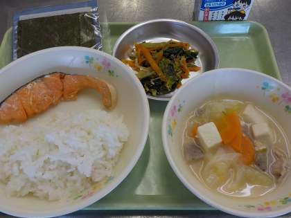 今日の献立:塩ごはん、手巻きのり、鮭の塩焼き、呉汁、小松菜とじゃこ炒め