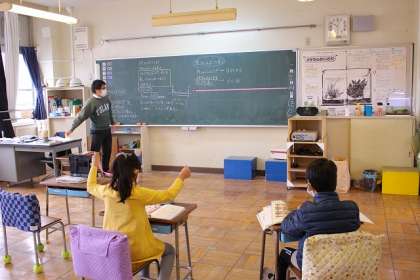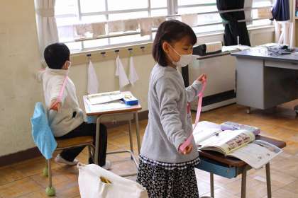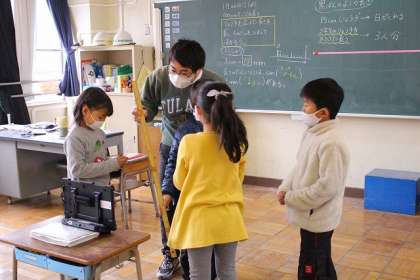 「100cmを こえる 長さ」両手を広げた長さを測り、100 cm をこえる長さの表し方を学習しています。