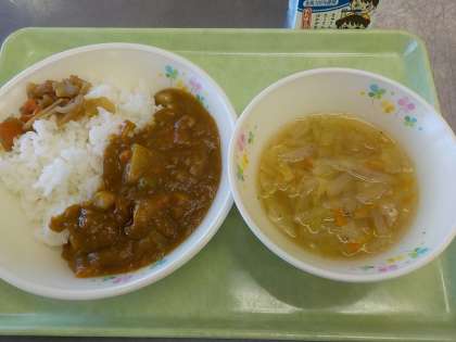 今日の献立:カレーライス、福神漬け、野菜スープ