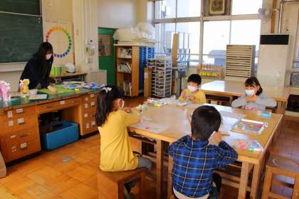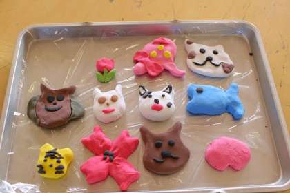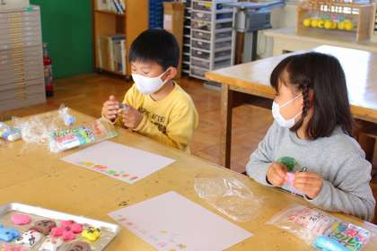 『くっつきマスコット』粘土を色混ぜして、好きなマスコットを作っています。