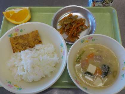 今日の献立:ごはん、いかの胡麻みそ焼き、こんにゃくとウドのきんぴら、呉汁、くだもの