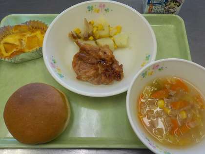 今日の献立:国産小麦パン、照り焼きチキン、コーンポテト、白菜スープ、桃のクラフティ