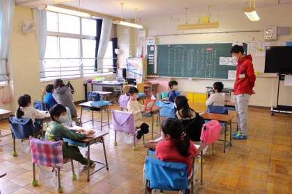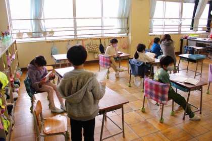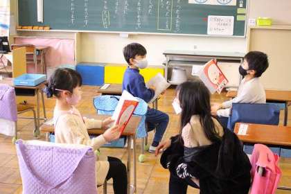 学校のことを伝え合おう。インタビューしたことを発表しています。