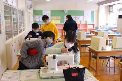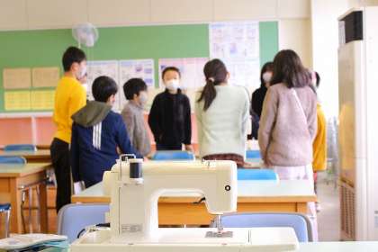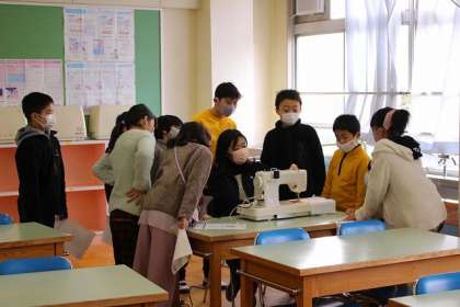 「ミシンにトライ!」ミシンの各部の名前を覚えながら、正しいミシンの使い方や気を付けることを学習しています。これから、安全に気を付けながら、ミシンの使い方を練習していきます。