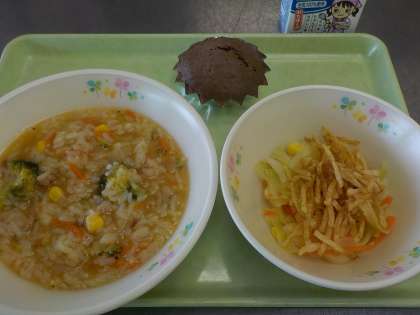 今日の献立:野菜リゾット、ポテチサラダ、ミニチョコカップケーキ