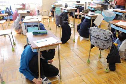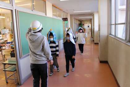 すぐさま机の下に避難しました。防災頭巾を着用し、廊下に整列しています。